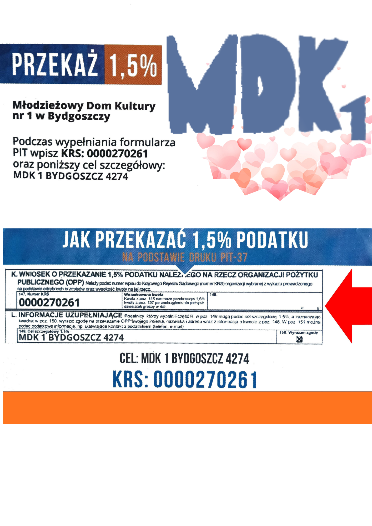 Podobnie jak w latach poprzednich, również i w tym roku, zwracamy się do WAS z prośbą o przekazanie 1,5 % swojego podatku na Młodzieżowy Dom Kultury nr 1 w Bydgoszczy.